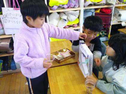 自分たちで作ったおもちゃを友達に遊んでもらう「おもちゃランド」を開きました。楽しんでもらえるようにおもちゃをパワーアップさせたり、看板を作ったりして準備してきました。友達が笑顔になっている様子を見てとても嬉しそうでした。