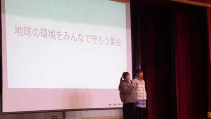 総合的な学習の時間に、環境問題について調べました。「全校のみんなに環境問題のことを知ってほしい」「みんなで地球温暖化を止めたい」と願い、全校集会を開きました。