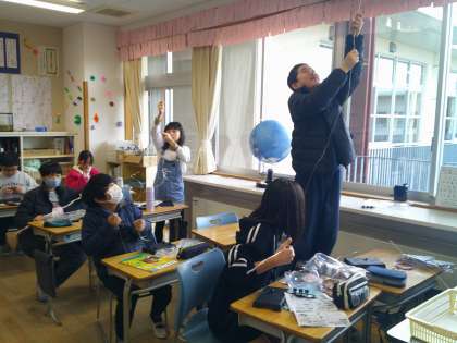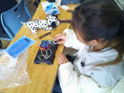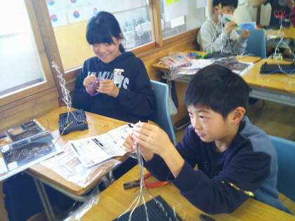 図画工作科「美しく立つはり金」の学習では、どこまで高く針金を立たせることができるか試した後、針金を曲げたり絡ませたりしながら、思い思いの作品をつくりました。