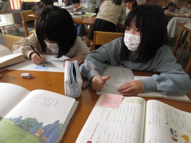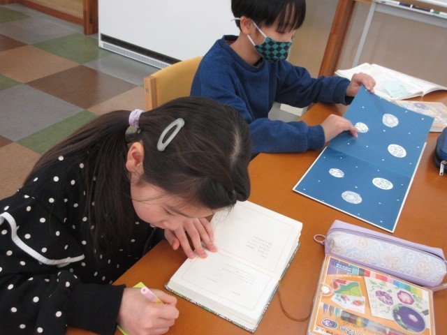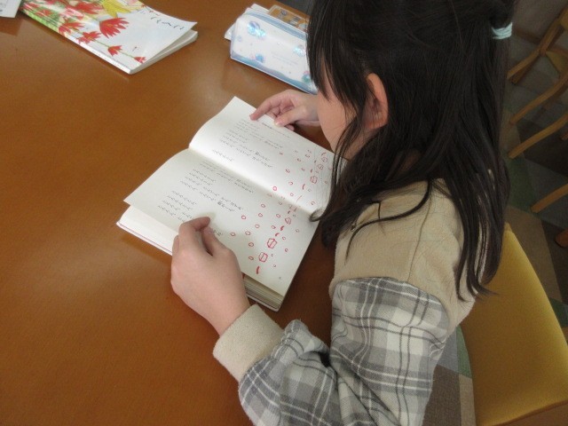図書室でいろいろな詩を読み、様子を思い浮かべたり、言葉の響きを楽しんだりしました。たくさんの詩集の中から、自分のお気に入りの詩を視写しました。