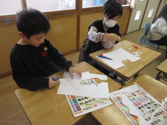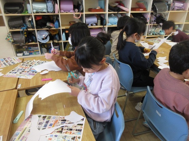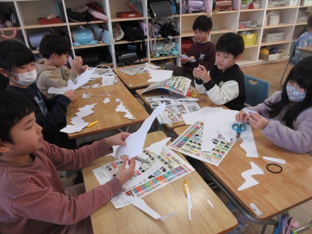 はさみを使って、画用紙をいろいろな方向に切りました。長いものやジグザグ、くねくねしたもの等どんどん切てみました。「これは、何に見える?」と友達と話しながら楽しく活動しました。