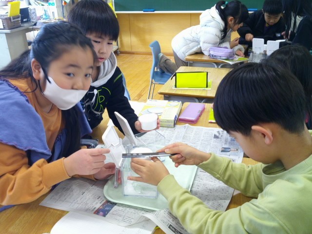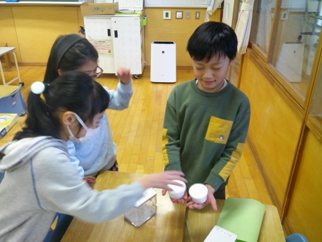 理科「ものの重さ」の学習では、塩と砂糖の重さを測りました。