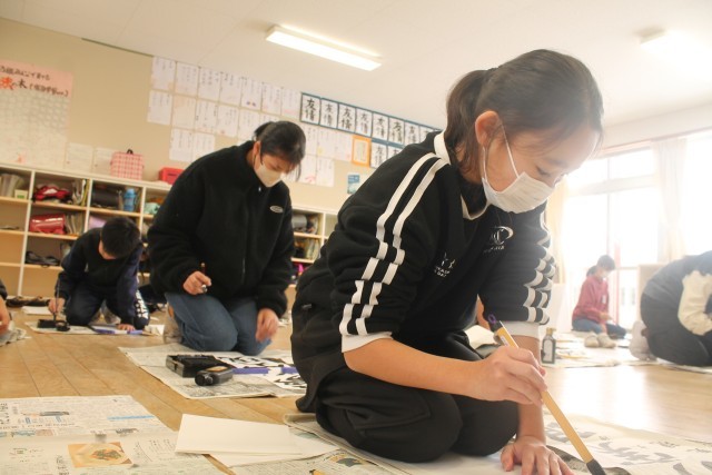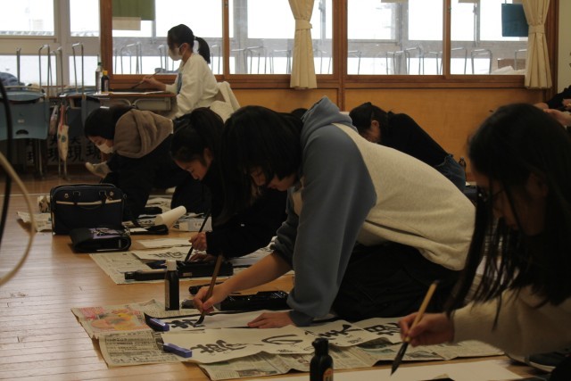 これまでの練習の成果を出そうと、墨液の付き具合を気にしながら書く様子が見られました。