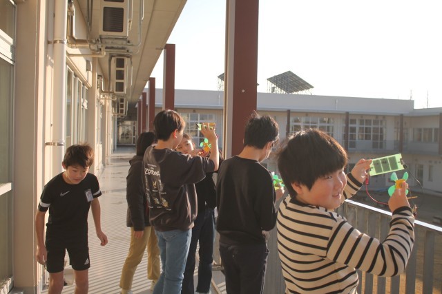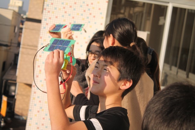 電気の実験で、太陽光パネルを利用して発電をしました。