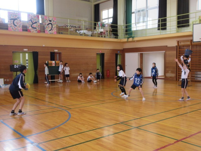 どうすれば見方にパスをつなぐことができるかを考えながら取り組んでいます。練習を重ねるごとに、ボールの投げ方や守備のかわし方等を工夫して動くことができるようになってきました。得点が入ると、歓声が上がります。