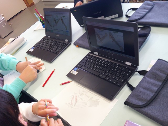 腕が曲がる部分と曲がらない部分のつくりをパソコンで調べながら学習しました。