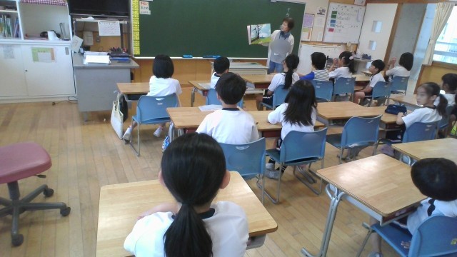 月曜日の朝は、読み聞かせの時間です。今日は、「ちいさいきみとおおきいぼく」と「このよでいちばんはやいのは」を読んでいただきました。