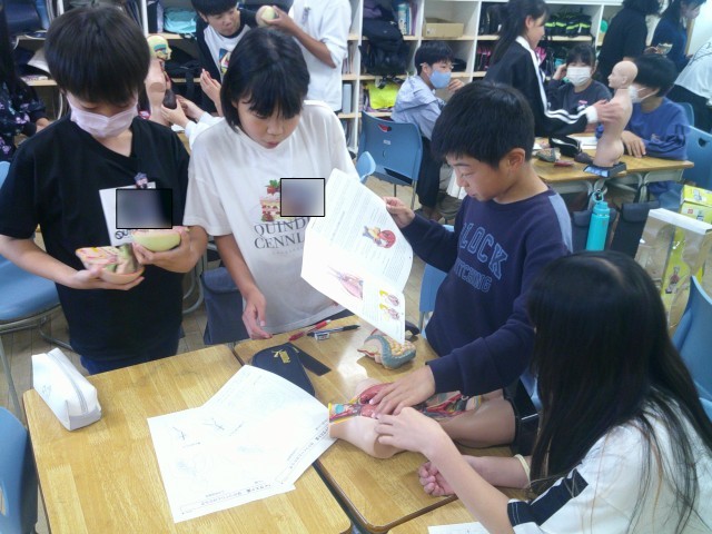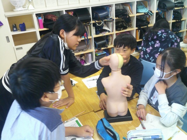 理科では「動物のからだのはたらき」の学習をしています。この日は人体模型を使って、臓器のはたらきや位置について確かめました。