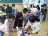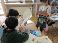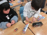 豆電球と電池をつないで明かりをつけました。 つなぎ方によって、明かりがつく...