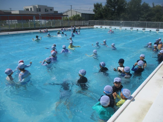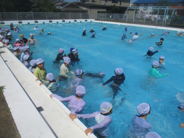 2年生はプールに入りました。プールサイドを歩いたり、プールの中でペアの相手を追いかけたりしました。最後の自由時間には、ビート板を使って泳ぐ練習をしたり、顔をつけたりしている子がいました。得意な子も苦手な子も楽しく安全に取り組むことができました。