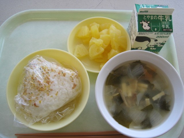 みそ汁の具には、長期保存ができる高野豆腐、わかめ、じゃがいも、