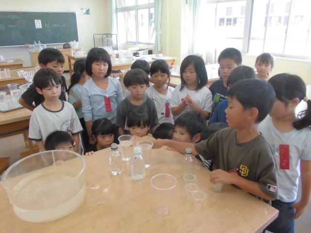 算数科では、2つのペットボトルの水のかさを比べました。いろいろな方法を試しながら比べ方を考え、みんなに紹介しました。
