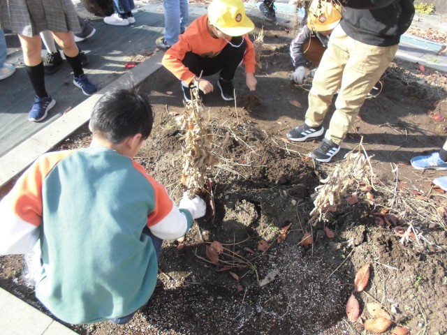 今日は、1学期から育ててきた大豆の収穫をしました。子供たちは、根についた土を落とすことに苦労しながらも、みんなで育てた大豆を収穫できました。