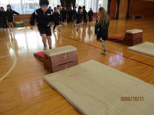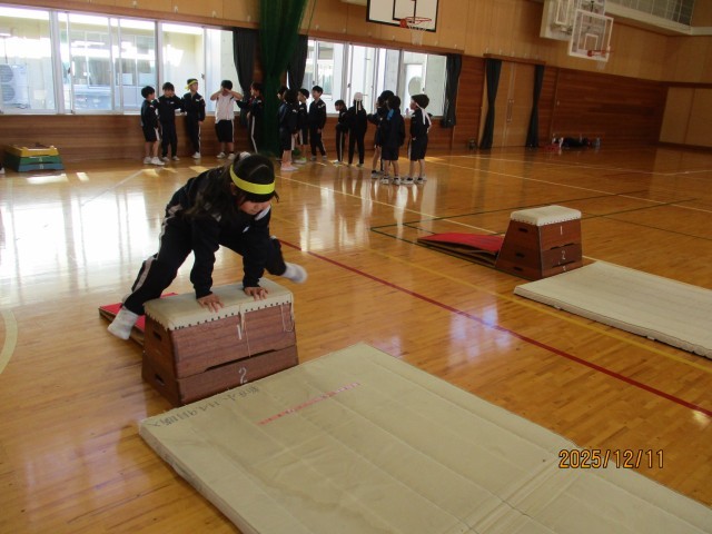 2年生は体育の学習でとび箱遊びをしました。手をついて跳んだり、ジャンプしてまたいだりして体を動かしました。楽しくリズムよく取り組むことができました。