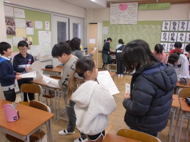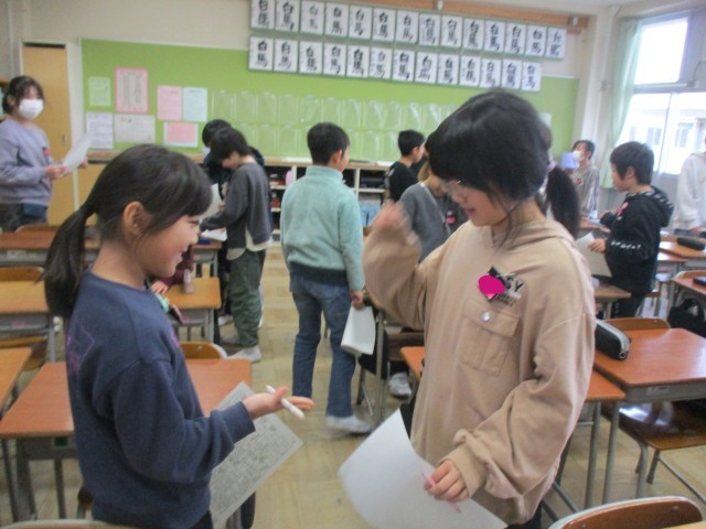 書初め大会後に、各クラスで学級活動「冬休みビンゴ」を行いました。冬休み中の友達の様子を知ることができ、久しぶりに顔を合わせてうれしそうに過ごす様子が見られました。仲間を大切にしながら、3学期も過ごしてほしいと思います。