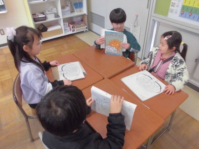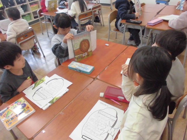 おすすめの本について、おもしろかったところをカードにまとめ、友達に伝えました。「だれが出ていますか」「○○とは何ですか」等、もっと詳しく知るために質問する姿が見られました。