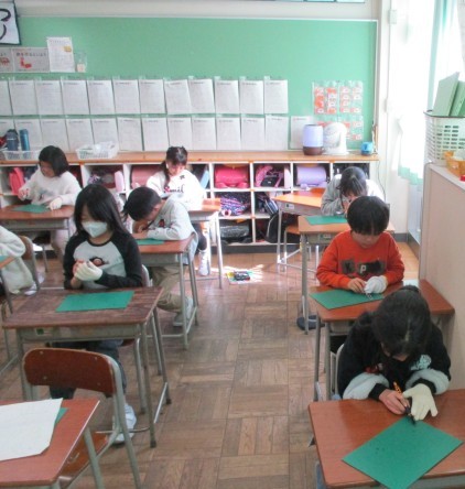 今日は、初めて彫刻刀を使ってゴム版を掘りました。子供たちは、掘り進める難しさを体感しながらも、一生懸命に取り組んでいました。