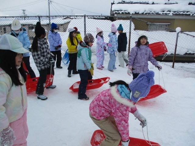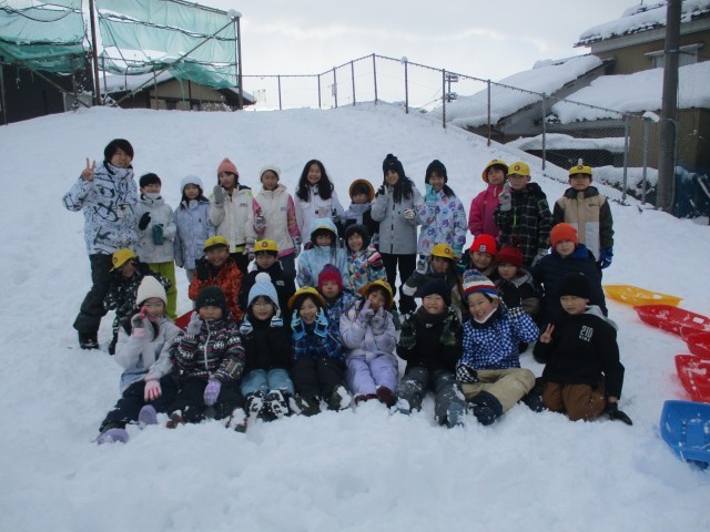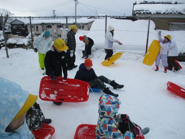 休みの日にたくさんグランドに雪が積もりました。子供たちは、そりを楽しんだり、友達と協力して大きな雪だるまを作ったりしながら活動していました。また、活動後に汚れた校内をきれいにする姿も見られ、最後の片付けまでしっかり考えて活動しました。