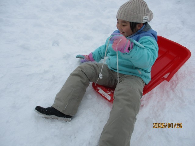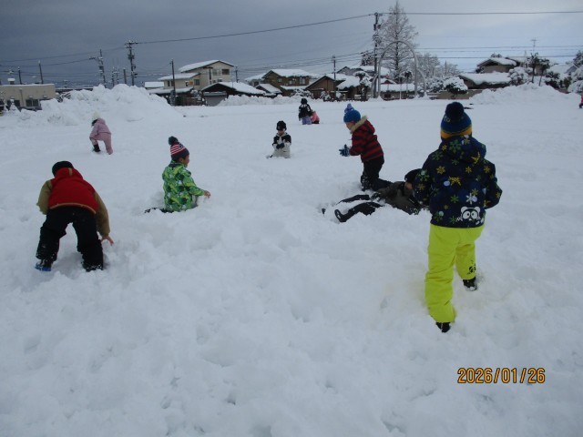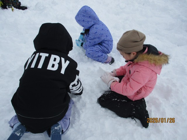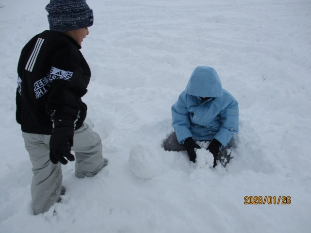 グラウンドで雪遊びをしました。寒さに負けない、元気いっぱいの2年生です。