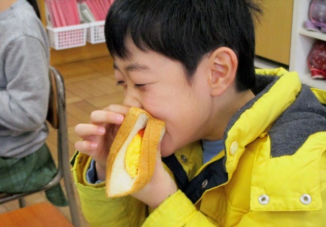 チョコレートペンシルで食パンのキャンバスに絵を描いたり、色々なおかずをパンにはさんで「カラフルサンド」をつくったりして、献立の色や形を楽しみました。