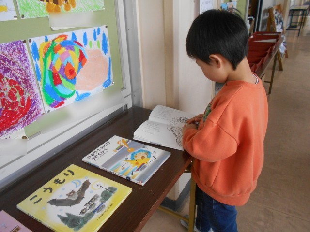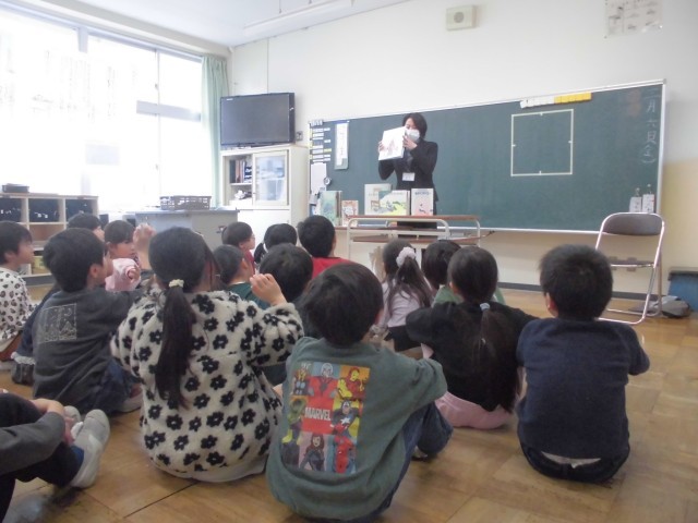 今日も、図書館司書の方に本の紹介をしていただきました。「どうぐ」「おと」等、テーマに沿った様々な本を教えていただき、子供たちは読書に親しみました。