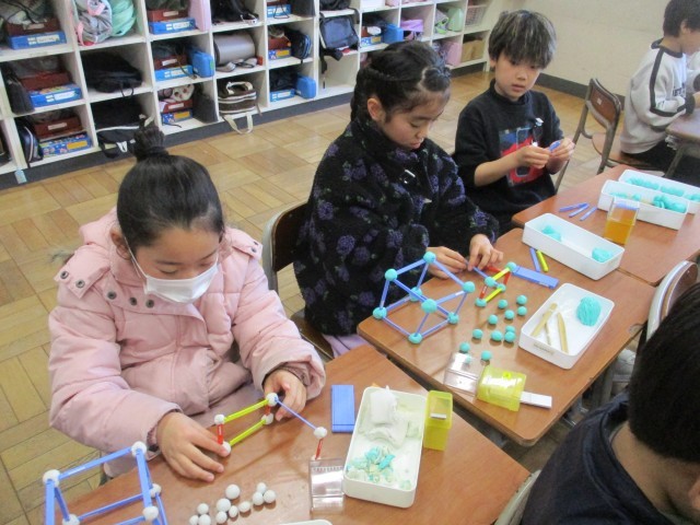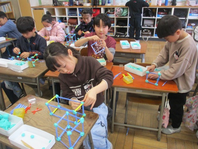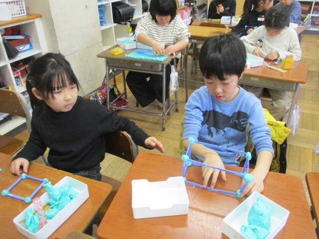 算数科「はこの形」の学習の様子です。粘土玉で辺と辺をつないで「ちょう点」の数を確認したり、辺の数を数えたりしました。形は違うけれど同じところがあると気付いたり、違いを見つけたりすることができました。