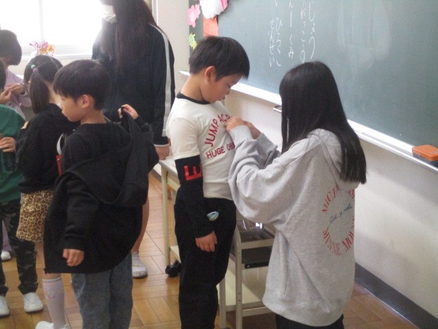 入学式の次の日から、6年生は毎朝1年生教室へ行き、朝の荷物整理を手伝ったり、ふれあいを楽しんだりしています。1年生から感謝されると、嬉しさから自然と笑顔になる6年生の姿が見られます。