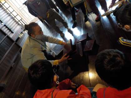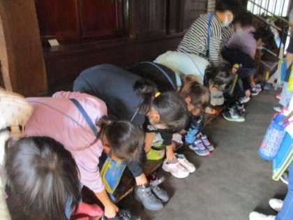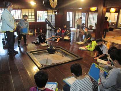校外学習で民俗民芸村へ行ってきました。民芸合掌館での子どもたちの様子です。