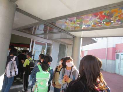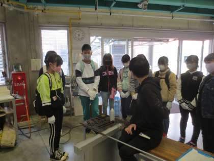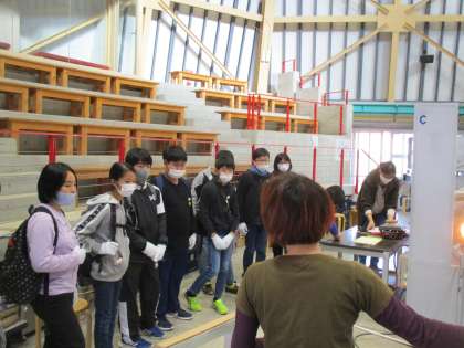 作業場へ向かう子供たち。通路の天井にもガラス作品があり、発見した子供たちは大喜びです。工房の方からガラスの作品づくりの説明を受けています。