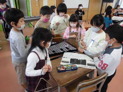 音楽科の学習で、星空の様子を表す音楽をつくっています。暗くなり始めた時、夜になって星がどんどん増えてきた時、夜が明けて明るくなっていく時の場面に分けて音楽をつくっています。様子を表すために、どんな順番で演奏するか、相談しています。