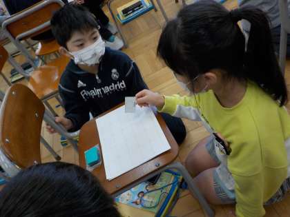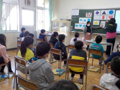 3年生の外国語活動の様子です。ありがとうカードを作るために、色や形、ほしいものをたずねる表現を練習しています。