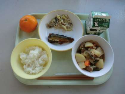 今日の献立は、「牛乳、ごはん、さんまの土佐煮、ビーフンソテー、豚肉とじゃがいものうま煮」です。