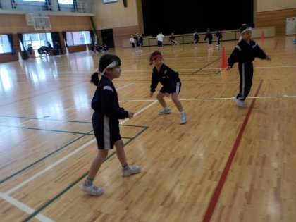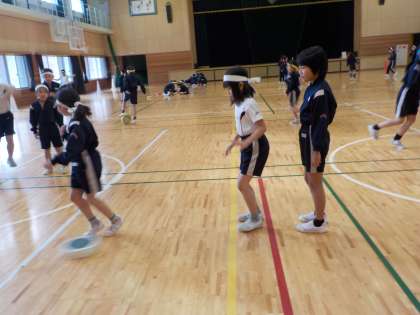 体育科では、「みんなでつなげ スライドサッカー」の学習を行っています。攻撃と守備に分かれ、どこに自分や友だちが動けばいいのかを、相手の動きやボールの場所等を見て考えます。また、友だちのよい動きを見つけては伝え合っており、みんなで上手になろうとしています。