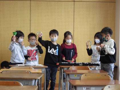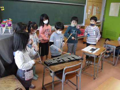 星空の様子の音楽をグループで作り、発表会をしました。「夜が明けるところだから、どんどん音を小さくしました」「星がたくさんちらばっている様子を表すために、楽器を少しずつ増やしていきます」などと、工夫したことを伝えていました。
