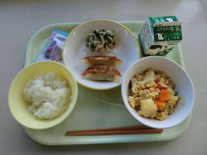 今日の献立は、「牛乳、ごはん、焼きぎょうざ、塩ナムル、たまごとじ、しらすのつくだ煮」です。