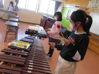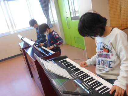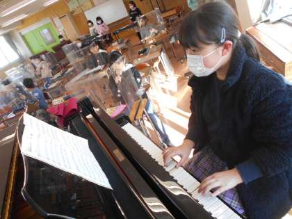 音楽で合奏を行いました。伴奏も自分たちで行い、すてきな演奏をしていました。子供たちの様子です。