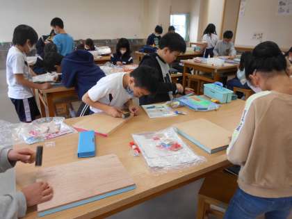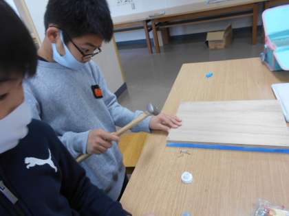 図画工作の時間にコリントゲームを作成しています。今日は、金槌を使って、周りの木枠を固定しました。金槌を使って、安全に気をつけながら真剣に取り組んでいる子供たちの様子です。