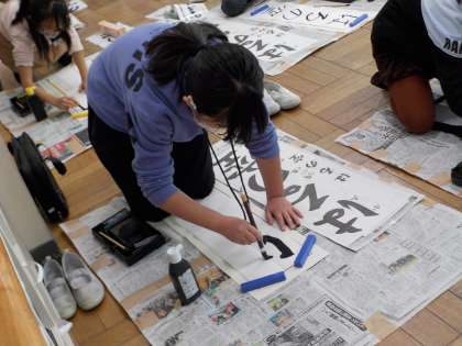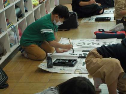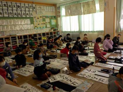今週、書き初め大会に向けての練習が始まりました。3年生は「はるの空」に挑戦します。机の上とは違い、床で筆を動かすことが初めてで、体の使い方に苦戦している様子でした。