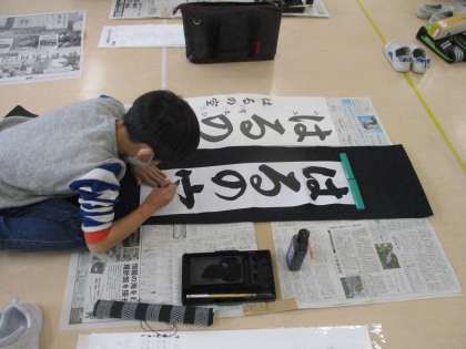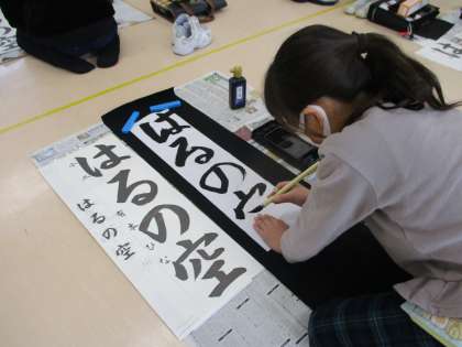 今週、書き初め大会に向けての練習が始まりました。3年生は「はるの空」に挑戦します。机の上とは違い、床で筆を動かすことが初めてで、体の使い方に苦戦している様子でした。