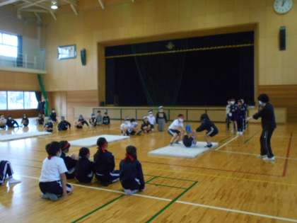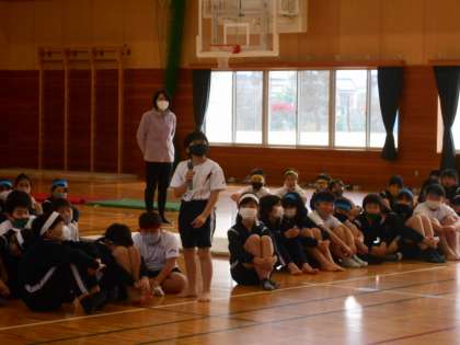 マット運動を今まで練習してきました。その中で、自分の自慢の技の1つを学年のみんなの前で発表しました。子供たちの様子です。