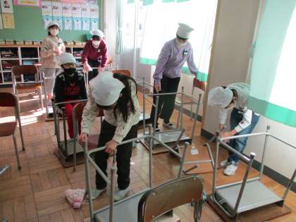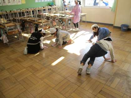 明日の終業式の前に、教室の床、黒板、窓、配膳台、下足箱をきれいにしました。冷たい水に手を入れ、雑巾を絞って、細かいところも友達と協力しながら、丁寧に掃除をしました。「今年一年ありがとう」「来年もよろしくね」という気持ちがとても伝わってきました。