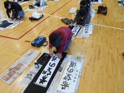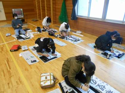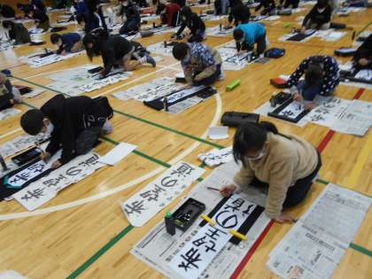 今年は体育館で書き初め大会を行いました。冬休みの練習の成果を生かし、「希望の道」という字をていねいに書いていました。