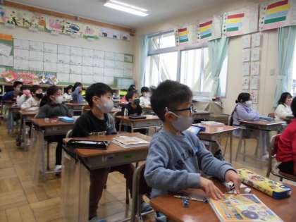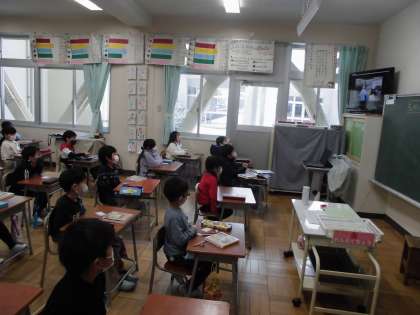 今日は学校給食週間に向けて、調理員の方が給食室で行っている調理の様子、片付けの様子のビデオを見ました。「こんなにたくさんの野菜を切ったり洗ったりしているんだね」「大きな機械があってびっくりした」「片付けをきれいにしないと調理員さんは大変だね」と感想を伝え合いました。調理員さんへの感謝のメッセージには、それぞれの思いをしっかりと書くことができました。