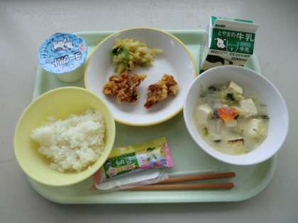 今日の献立は、「牛乳、ごはん、ほたてのかりんあげ、チンゲンサイひたし、とうにゅうじる、なっとう、ヨーグルト」です。※先週の臨時休業に伴い、献立が一部変更になっています。