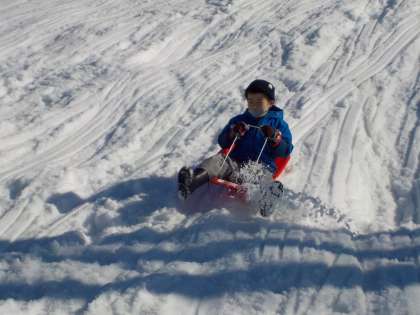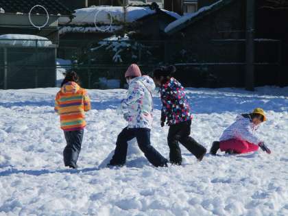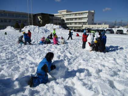 たくさんふった雪で歩くのが大変だと言いながらスキー山まで歩き、そりすべりを楽しんだ子や、大きな雪だるまを作ろうと3人で力を合わせて転がしている子、自分が好きなキャラクターを作ろうとしている子など、雪での遊び方を自分で見つけて楽しんでいました。