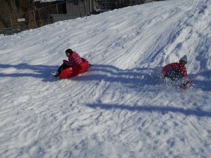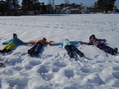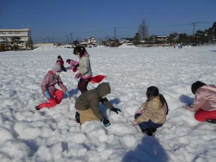 今日はグラウンドで雪遊びを行いました。昨年度は雪がほとんど降らず、このようにグラウンドいっぱいに降り積もった雪を見ることがなかったため、思いっきり雪世界を味わうことができました。そりや雪のかけ合い、新雪へのダイビングなど、思い思いに雪遊びを満喫していたようでした。