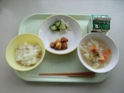 今週は学校給食週間です。テーマは「本の世界を味わおう 〜読んで楽しい、食べておいしいお話」です。今日の献立は、「牛乳、ほっぺたおとしのまめごはん、ぶりと高野どうふの香味ソース、すずなのゆずあえ、具だくさんじる」です。