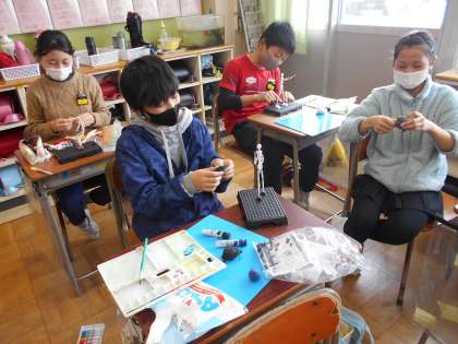 体育ではビーチバレーボールを行っています。チームごとにサーブやアタックなどの練習に楽しく取り組んでいます。図工では「12年後のわたし」と題し、紙粘土を針金の芯材にくっつけ、将来の自分の姿を制作しています。係活動にも積極的に取り組むなど、いろいろな活動に全力で取り組む子供たちの姿が見られます。