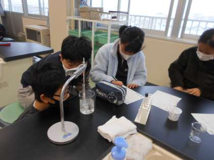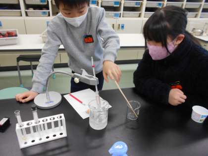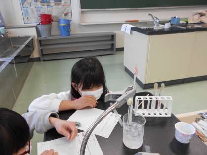水が冷やされるとどのように氷に変化するのか、温度や様子を1分ごとに観察しました。子供たちの様子です。