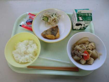 今日の献立は、「牛乳、ごはん、あげ魚のレモン味、塩ナムル、牛肉と大根のごますき煮、節分豆」です。